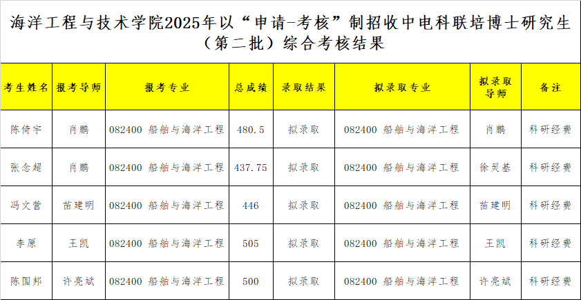 海洋工程与技术学院2025年以“申请-考核”制招收中电科联培博士研究生(第二批)综合考核结果公示