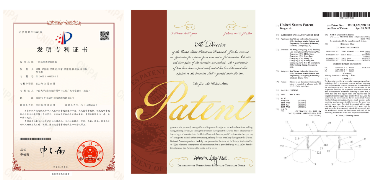 基于该技术方案,课题组联合南方海洋科学与工程广东省实验室(珠海)申请专利,先后获得中国发明专利授权(专利号ZL202210046284.2)、美国发明专利授权(专利号US11629938B1)共2项。其中第一申请人为中山大学,第一发明人为邓锐副教授,其他发明人包括我院吴铁成副教授、苗建明副教授、杨建敏副教授,以及我院硕、博士研究生罗富强、李豪、张泽振、胡予潇、宋志杰、任航、李豪、于祥、刘海龙、黄思翀等。